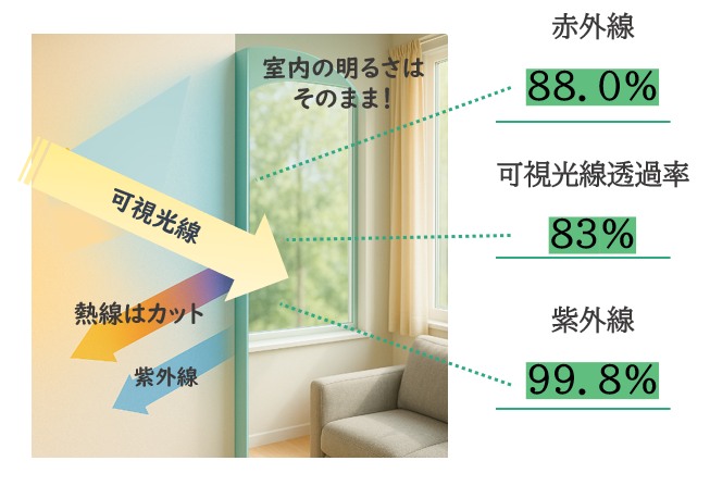 ザ・ナイスブロックーGは明るい光を通しながら、暑さの原因のとなる熱線を大幅にカットします